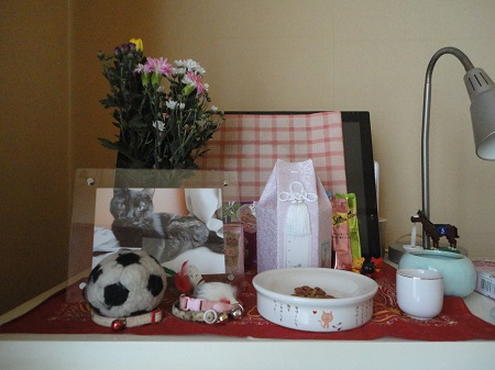 お花が変わっただけで、あとは以前と変わりがありません。お盆だから、もしかしたらヒメが帰ってくるかもしれないと、キャットタワーはもうないので、私が扉を開けると、ヒメがとどこからともなくすっ飛んできて中に入ったり、棚で上下運動していたリビングのクローゼットや玄関の下駄箱クローゼット、キッチン・シンク下の扉を開けっ放しにしておいたけど・・・ヒメは中に入って遊んだり、くつろいだりしたのかな?