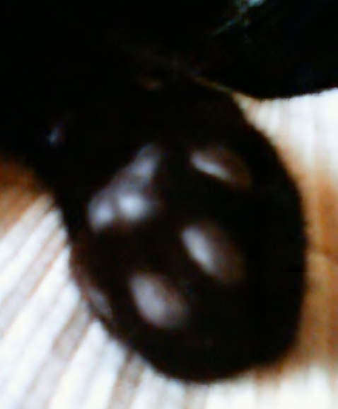うちのねこ「ヒメ」(めす3~4歳)の毛色は基本「黒(実際は黒サビ)」なので肉球ちゃんもこのように基本「黒」です。でもヒメちゃんは「黒サビ猫」なので実はひとつの脚だけ肉球が・・・今回は秘密です。いつか公開すると思います。