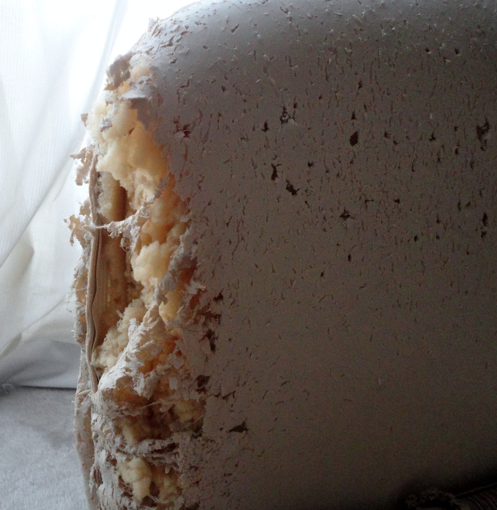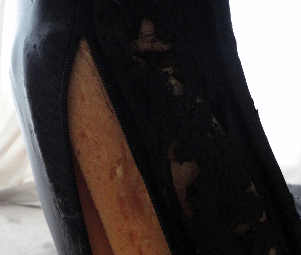 「ぱっと見」では何んともなさそうに見えていますが、画像のように裏(側面?!)のスポンジが出ちゃっています。よく見ると表面がやられてスポンジが顔を出しているのがおわかりになるかと思います。