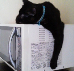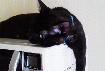 ヒメちゃん、こんな感じで今朝は、電子レンジの上で前足をだら~り。夏場の暑い時期はレンジの上にお腹をのせてクールダウンでもしているのかな?