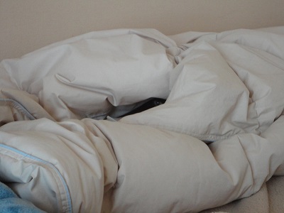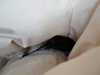 (周囲に背の高い家具などがない場所の羽毛布団に隠れたヒメ隊長)