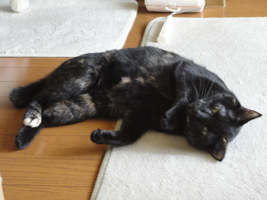 このように「コテ~ん」となり、「遊ぶにゃ!」のポーズ・・・。「う~ん・・・」。でも、もしかしたらお腹が空いてないのかも?!とか思っていた時に電話が入り、野暮用で「ヒメちゃん」をほったらかしでしばし外出することにした。