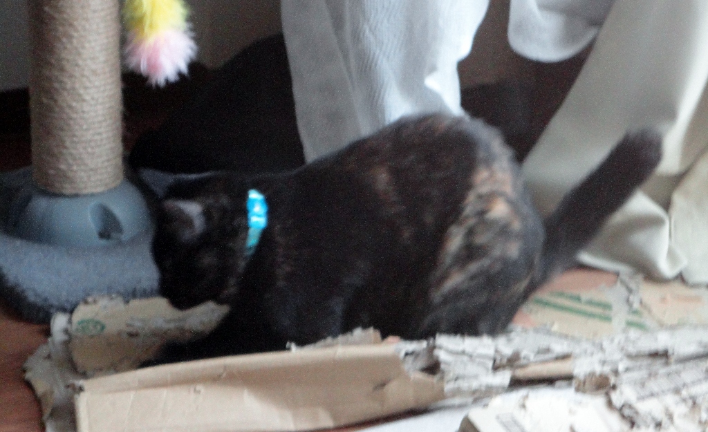 飼い主が休日部屋にずっといるのに、飼い主が疲れていて一緒に遊んでくれないとヒメちゃんは勝手に遊びはじめます。まずはお気に入りの段ボールで爪とぎ(準備運動なのかな?)