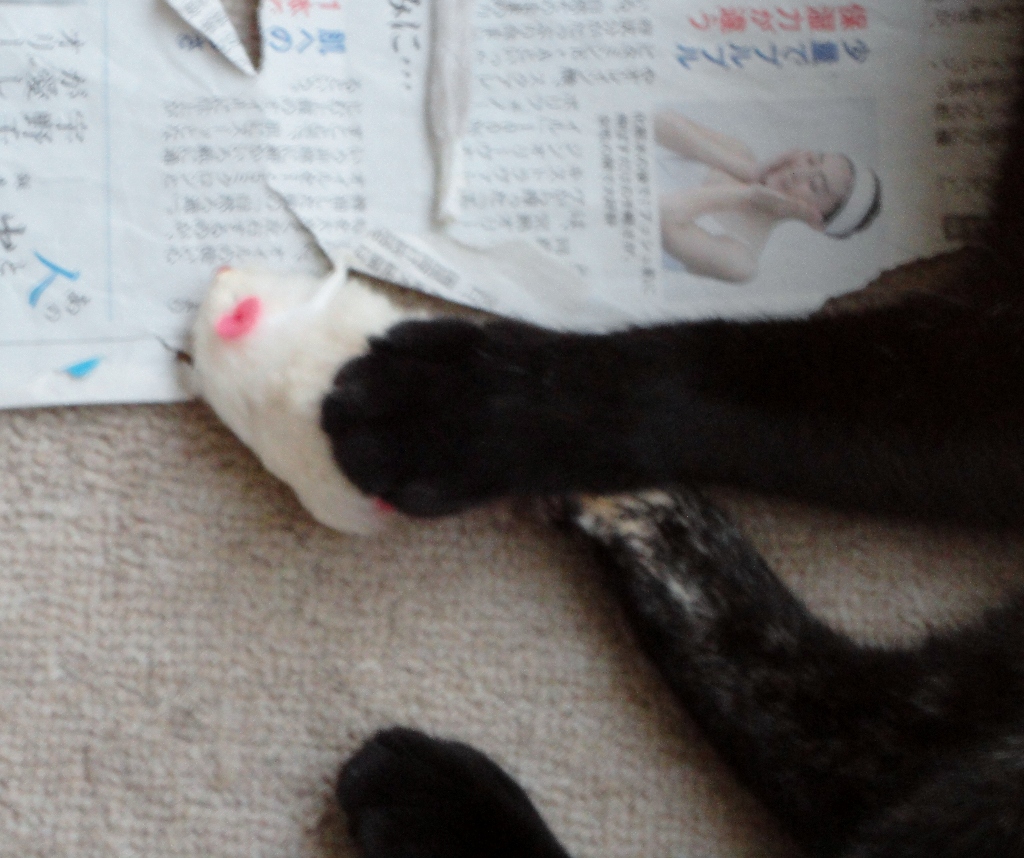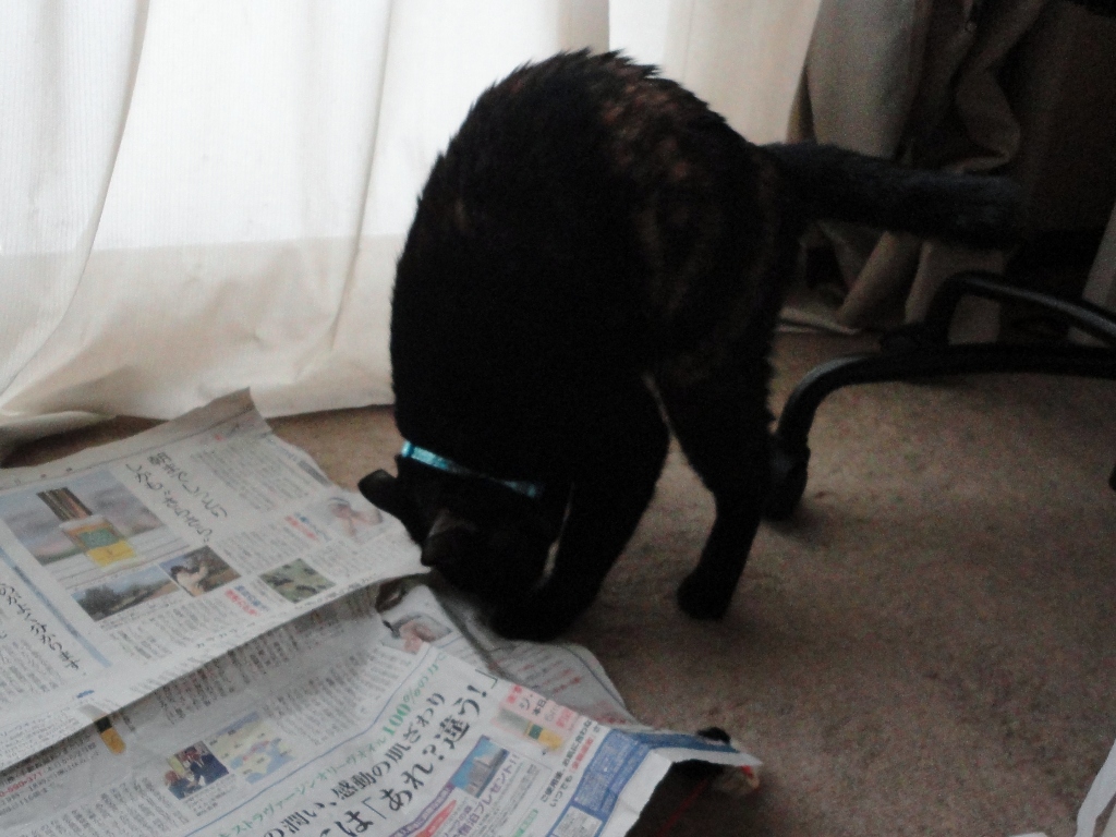 ジャンプして頭から新聞紙に突っ込み、「ガサガサ&たしっ!たしっ!!」と、しばし格闘の後・・・